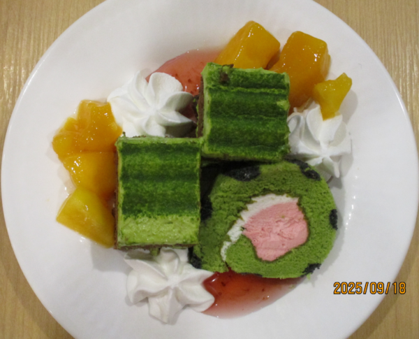 今月のケーキは抹茶ロールケーキ😃ストロベリーソースとフルーツ・ホイップ添え🎵