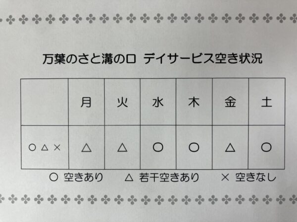 10月空き状況 公開済み: 2025年10月1日更新: 2025年9月29日作成者: 万葉のさと溝の口カテゴリー: 溝の口 暑さもだいぶ和らぎ、朝晩は少し肌寒く秋も感じてきましたが、まだ日中は25度以上の日もあるので体調には十分注意してくださいね! ↓↓↓空き状況はコチラ↓↓↓お気軽にお問い合わせください!スタッフ一同、心よりお待ち申し上げます!! 関連記事 tea time music だんだん暖かくなってきた今日この頃。みなさんいかがお過ごしでしょうか? 先日、万葉のさと溝の口ではフルートコンサートを行いました!このフルート奏者、実は、、、万葉のさと溝の口で送迎ドライバーとして勤務してるスタ…続きを読む 公開済み: 2023年4月21日更新: 2023年4月21日作成者: 万葉のさと溝の口カテゴリー: 溝の口 手作りマスクいただきました 入居者の友人の方から、「介護施設では必要でしょう、使ってください。」と、「手作りマスク」を沢山いただきました。マスクが手に入らない時に本当にありがとうございます。優しさが心にします。大切に使わせていただきます。 公開済み: 2020年4月27日更新: 2020年4月27日作成者: 万葉のさと横浜(住まい)カテゴリー: 溝の口 春の壁紙 温かくなり花や草木の生える今日この頃です。利用者の方々に手作業レクをお願いしました。桜の花とたんぽぽです。スタッフも一緒に作っています。こちらが、完成した作品です。桜が満開に咲き桜の木の下には、タンポポが咲いています。早…続きを読む 公開済み: 2021年3月23日更新: 2021年3月23日作成者: 万葉のさと溝の口カテゴリー: 溝の口