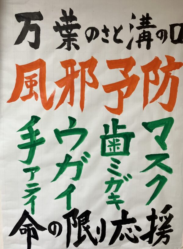 風邪予防対策 公開済み: 2025年10月15日更新: 2025年10月9日作成者: 万葉のさと溝の口カテゴリー: 溝の口 インフルエンザが流行りだしてる今日この頃。皆様、体調はいかがでしょうか? ご利用者の方が書いてきて下さいました!習慣付けて、この冬を乗り越えましょう! 関連記事 紫陽花とJune Bride ↓↓↓今月の壁面製作はコチラ↓↓↓とてもカラフルな紫陽花に囲まれての結婚式!!いやぁ~、めでたいっ!!! んんんっ!?!?!? いや、全部スタッフ(笑)!!!!しかも新郎と新婦は同一人物(…続きを読む 公開済み: 2025年6月16日更新: 2025年6月12日作成者: 万葉のさと溝の口カテゴリー: 溝の口 節分イベント 「鬼は~外!福は~内!」今年の節分イベントは、“万葉のさと溝の口に鬼が襲来し、お侍さんとご利用者の皆様の豆まきで鬼を退治する”という、演劇に挑戦しました!今回のポスターは、いつもよりスタッフの顔がイケメンに撮れてますね(…続きを読む 公開済み: 2024年2月13日更新: 2024年2月16日作成者: 万葉のさと溝の口カテゴリー: 溝の口 花と3月 3月になり、寒暖差で体調は崩されてませんか?まさに“三寒四温”!だんだん春が近づいて来てますね! ご利用者の方が書いて来てくださいました!!! 2025年はちょうど“昭和100年”なんですね!!そして…続きを読む 公開済み: 2025年3月17日更新: 2025年3月15日作成者: 万葉のさと溝の口カテゴリー: 溝の口