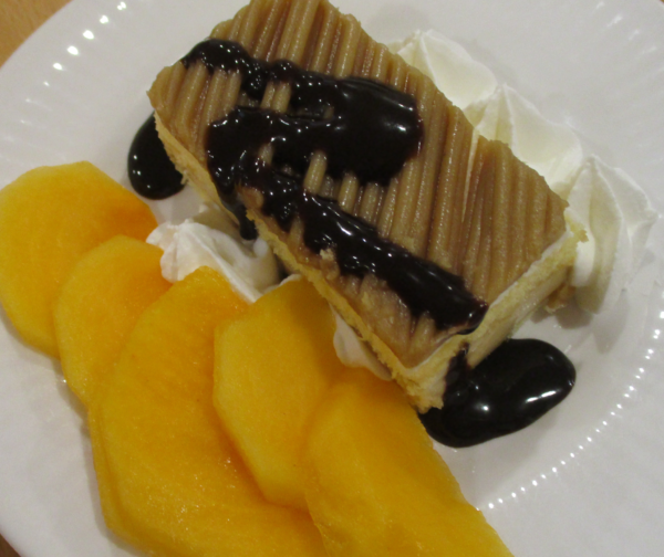 マロンケーキチョコシロップがけに柿をトッピング👍✨