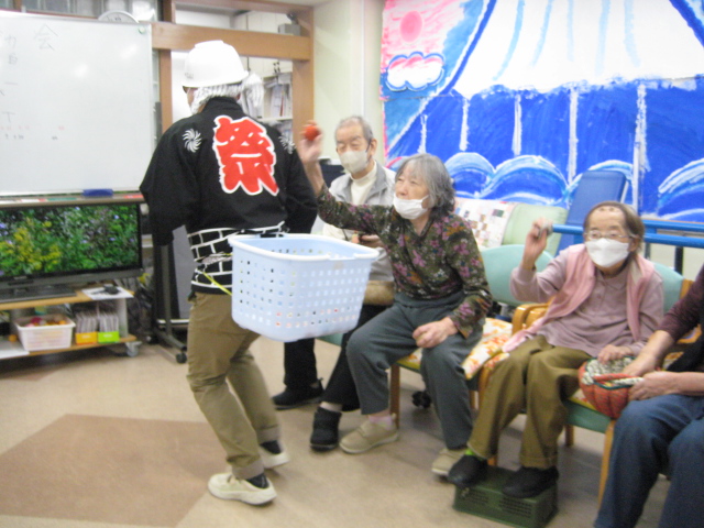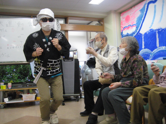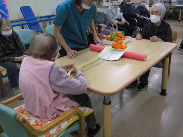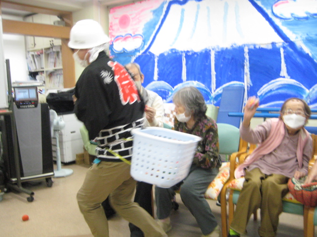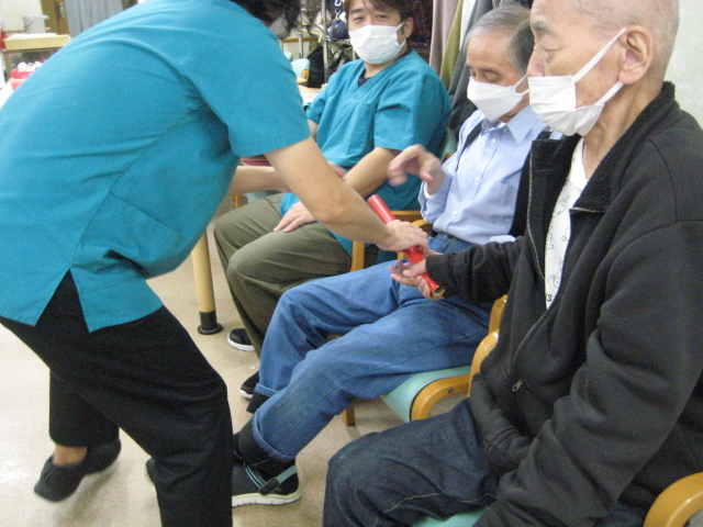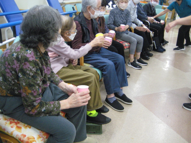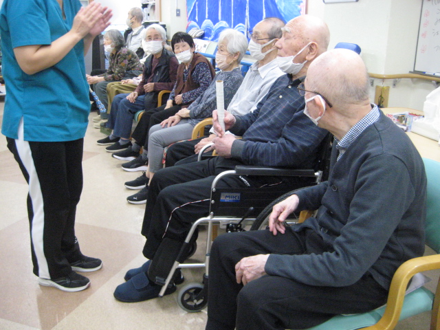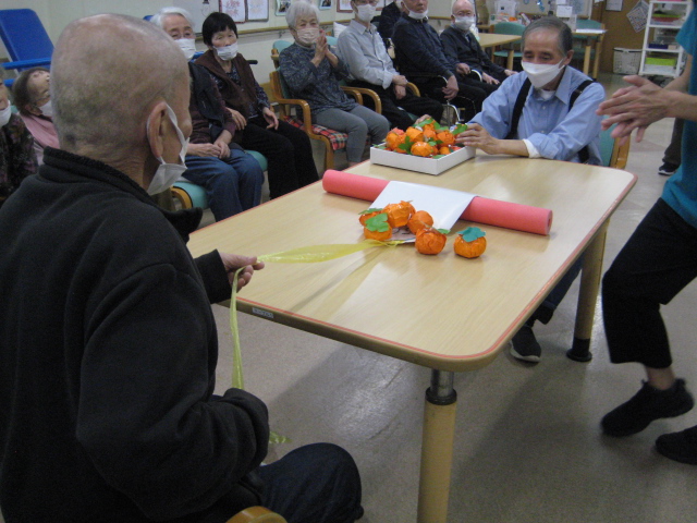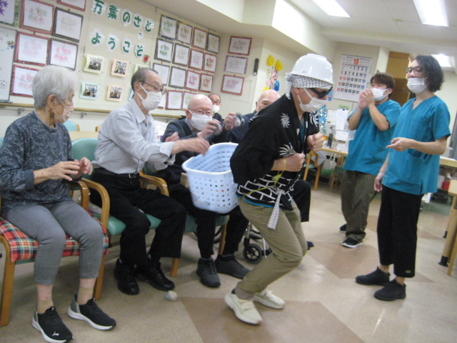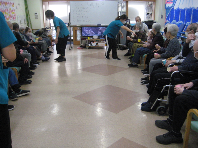 ★☆秋の大運動会!!★☆ 公開済み: 2025年10月28日更新: 2025年10月28日作成者: 万葉のさと大口カテゴリー: 大口 秋の大運動会!! 始まりました!!素晴らしい、5つのゲームがあります。まずは向かって左側が赤組 右側が白組に分かれて 1番目の「たまご落としゲーム」からスタートこれは簡単です。小さいお手玉をコップに順番に入れて回していき、最後の方へ バトンタッチしてゴールイン!!!コンパクトリレーですね。これは できない所はスタッフが優しくサポート。◇◆最後はかごの中にゴールイン◆◇ おめでとう、このゲームは白組勝ちました!!!■2番目のゲームは「ともだちのWA!!」大きいリングを両手でうまくつないで隣の方へバトンタッチ 回してますね。これは、なかなか難しいですよ。頑張って!!やりましたぁ!!こちらは赤組の勝ちでしたぁ やっぱり勝つと嬉しいものですね。次は「しりとりリレー」ゲームいきましょう!! 写真だと、何かと伝わりにくいのですが、しりとりでバトンを隣の方へつなげるところ何ですよ。言わないとわからないですよね...。見ての通リ、白組の連携がすばらしく...これで優勝ライン赤組も頑張ってますよ~お見事!!最後の追い上げで紅組の勝利でしたぁ。白組がんばれ!!さぁ~大番です。4番目のゲームは「柿ドロボーゲーム」です。これは見ての通リ!!障害物リレーみたいなものです。紐でひっぱって皿の上に柿を落とさない様に運び何個とれたか競うゲームですよ。これは夢中になりますね!!納得赤組の男性陣もなかなかの腕前そろってさすがです。頑張って~これは白組勝ちました!!おめでとうございます。やっぱり負けているチーム応援したくなりますね。おーーーーッと、これは何ですか!!最後のゲーム「激突!玉入れゲーム」登場!!男性スタッフの背中の籠の中に何個、お手玉が入るか競うゲームです。あっちこっち回ったり、どこへ行くかわかりません。みな様 がんばってください!!逃げ足早いから気をつけて!!最後の追い込みです。盛り上がってきましたよ...これは!!おーーーーーっと体力消耗か 頑張れ!!ファイト一発!!ゲーム終了!!なんと大逆転 白組優勝!!わかりますか。籠の中のお手玉の数が凄い量なんです。本当に皆様 お疲れ様でした。これはもう、ゲームに参加した全ての方が優勝者です。 関連記事 コロナに負けないマスクつくりました!! ・・・ご自身でマスク作りました。次回はもう少し良く仕上げるそうですよ。滅菌ガーゼで使用しました。ゴムがないからTシャツの生地使用です。頑張って紐を結んでますよ。 こんな感じで事前にゴム代わりのTシャツの紐も作ってるんです…続きを読む 公開済み: 2020年4月20日更新: 2020年4月20日作成者: 万葉のさと大口カテゴリー: 大口 富士山のアート完成しました!! 富士山のアート完成しました!! ご利用者様から「 温泉に来た気分ですよ。 」「パァーーッと明るくなっていい!!」 と思った以上に評判が良かったです…続きを読む 公開済み: 2019年3月22日更新: 2019年3月22日作成者: 万葉のさと大口カテゴリー: 大口 打ち上げ花火大壁画 完成しました!! 花火大会の特大の壁画いかがでしょうか。ご利用者様、スタッフ 関係者の皆様に猛暑を乗り越えてリフレッシュしていただこうと実は施設長の私が一人で作成しました。時間と予算はかかり苦労しましたが、予想以上の大拍手と…続きを読む 公開済み: 2018年8月4日更新: 2018年8月4日作成者: 万葉のさと大口カテゴリー: 大口