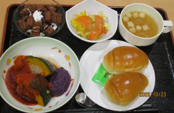 パンプキンの肉詰め★マリネサラダ★オニオンスープ★ロールパン★ハロウィンデザート(^^♪