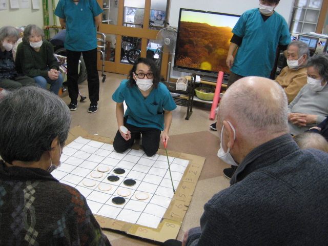 〇◉〇ジャンボ!!オセロゲーム〇◉〇 公開済み: 2025年11月10日更新: 2025年11月10日作成者: 万葉のさと大口カテゴリー: 溝の口 おかえりなさい!!ジャンボオセロゲーム 久しぶりに行いました。どこにオセロをおくか、皆様で考えているところです。動く脳トレは意外と難しいです。どこにオセロをおくか決まったら、スタッフが皆様の代わりにおきます。一の番シンプルでおもしろいゲームですね。何度やっても飽きません。優勝はオセロ黒色側の黒チームでした。 関連記事 認知予防体操レク、始めました! 万葉のさと溝の口では、個別機能訓練以外にも身体を動かす機会(朝のラジオ体操・お食事前の口腔体操・食後の機能体操・帰宅前の音楽体操)はありますが、、 最近物忘れが多くなってきた方やレクリエーションへ不参加の方、も…続きを読む 公開済み: 2024年6月24日更新: 2024年6月7日作成者: 万葉のさと溝の口カテゴリー: 溝の口 万葉のさと運動会 先日、運動会を開催致しました!!!! 今回のポスターはコチラ!!!! 今回もなかなか良い仕上がりです(笑)!!! 毎回イベントごとに職員をメインにしたポスターを作成していますが、ご利用者の方々からも好…続きを読む 公開済み: 2023年11月6日更新: 2023年11月4日作成者: 万葉のさと溝の口カテゴリー: 溝の口 あら不思議、手品みたい! ニワトリの絵柄のハンカチからあら不思議、卵が産まれました。すると観客から「凄いわね、手品みたいねー?!」という感嘆の声が上がりました! 公開済み: 2020年2月19日更新: 2020年2月24日作成者: 万葉のさと横浜(住まい)カテゴリー: 溝の口