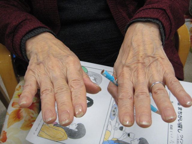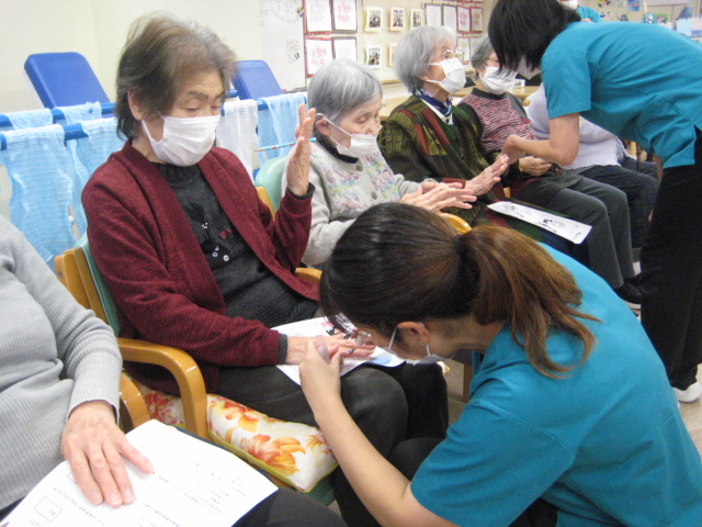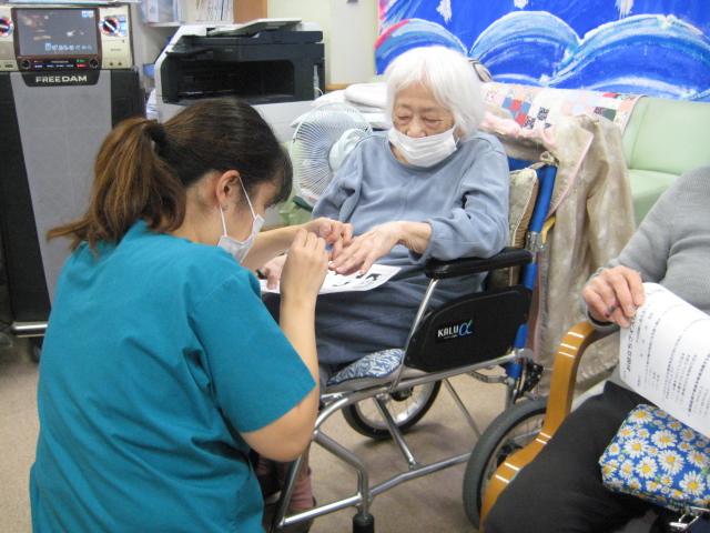 ★☆ネイルケアしました。★☆ 公開済み: 2025年11月12日更新: 2025年11月12日作成者: 万葉のさと大口カテゴリー: 大口 何かと忙しく慌ただしい時期になりましたね。こんな時こそ癒しと気持ちの安定が大事と思い、ネイルケア始めてみました。おっと...おわりましたね。やっぱり顔の表情がちがいます。いい顔していますね♪♪軽めのマニキュアですが、なかなかいいですよ。みな様に大好評です。とにかく大人気で、できる範囲内で、みな様に提供中!!心身のケア目的にベストですね。 関連記事 新作ゲーム ピンボールアタック!!はじめました。 どのどん新作ゲーム初めています!!ピンボールアタックゲームです。紙のお皿の真ん中の穴にボールを落として得点を上げるゲームです!!青のコップ 100点 ピンクのコップ はずれ 黄色のコップ 50点最後は優勝決定戦!! ワン…続きを読む 公開済み: 2024年5月11日更新: 2024年5月11日作成者: 万葉のさと大口カテゴリー: 大口 猛暑とコロナに勝つ!!願掛け風鈴 夏 2022 ようやく猛暑と真夏のコロナとの闘いの8月が終りますね。ほんの少し、ほっとできますかね。まだまだ残暑もあり9月も、この願掛け風鈴は継続します。皆様の熱い願いには頭が下がります。・・・やっぱりこの言葉でしょう!!シンプルにス…続きを読む 公開済み: 2022年8月31日更新: 2022年8月31日作成者: 万葉のさと大口カテゴリー: 大口 今月最後のお菓子レクです。 早いもので3月は終わりますね。お菓子レクは、ちょっぴり大変ですけど何事もがんばる事が大事ですね。最後に皆様で召し上がると格別においしく、やりがいを感じる見たいです。 公開済み: 2025年3月31日更新: 2025年3月31日作成者: 万葉のさと大口カテゴリー: 大口