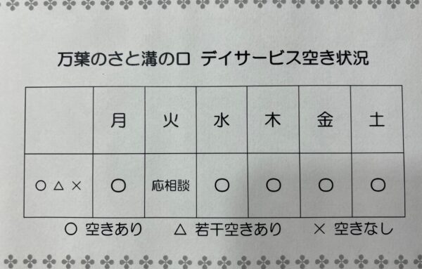 4月空き状況 公開済み: 2026年4月1日更新: 2026年3月30日作成者: 万葉のさと溝の口カテゴリー: 溝の口 新年度が始まりました!桜も満開!新たな気持ちで日々、楽しく過ごしていきましょう! ↓↓↓空き状況はコチラ↓↓↓空きが多数出ています!!!ご見学のお問合せなどはお早めに!!! 関連記事 日常風景~テーブルレク④(折り紙・卓球・ボードゲーム)編~ 「折り紙工作」毎月の壁面製作や各自の作品を作成されてます! 「卓球」リハビリとは別で良い運動になるようです! 「ボードゲーム」人生ゲームで一攫千金狙ってます! 万葉のさと溝の口ではさまざまな…続きを読む 公開済み: 2025年6月14日更新: 2025年6月5日作成者: 万葉のさと溝の口カテゴリー: 溝の口 デイでの日常(ゲームレク) 今回は、こんなゲームレクを行いました。「コロナに負けるな!?買物移しゲーム」です。内容は、カゴに入っている食材?をもう一つのカゴに移し変えるゲームです。職員が皆様に、説明しております。端の利用者さんが終わったら終了です。…続きを読む 公開済み: 2020年6月30日更新: 2020年6月30日作成者: 万葉のさと溝の口カテゴリー: 溝の口 ハッピーハロウィン 今月の壁面製作は「ハロウィン」をテーマに製作しました!なんだかホウキに乗って、はしゃいでる人たちがたくさんいますねぇ(笑) 最近、スタッフが居る壁面製作がご利用者の皆様に大好評で、「〇〇さん(スタッフ名)、ここにいるのね…続きを読む 公開済み: 2024年10月15日更新: 2024年10月19日作成者: 万葉のさと溝の口カテゴリー: 溝の口