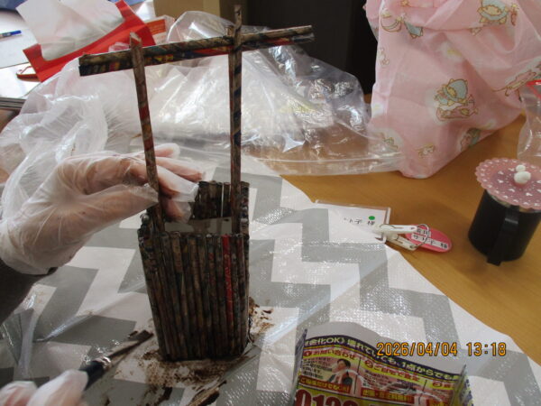 こちらは広告と牛乳パックで作られた花瓶です(^^♪ 最後はニスを塗って本格的な仕上がりになりました!