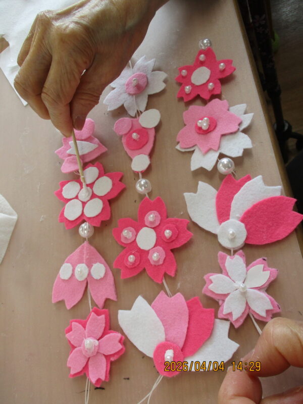 こちらはフェルトとパールビーズを組み合わせて桜の飾りを作成中です。