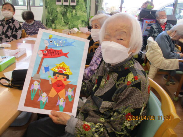 来月の端午の節句にちなんだこいのぼりと金太郎が、素敵に出来上がりました。指先を器用に使い脳トレですね!