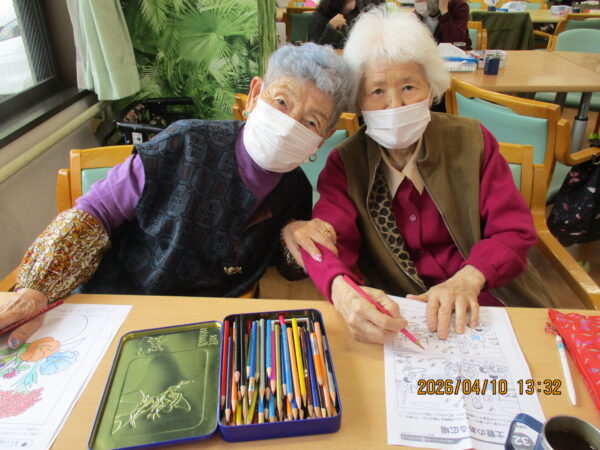 こちらの方は塗り絵と脳トレをされています。塗り絵出来上がったり、脳トレ問題が解けると達成感がありますね!!